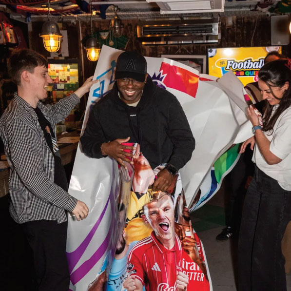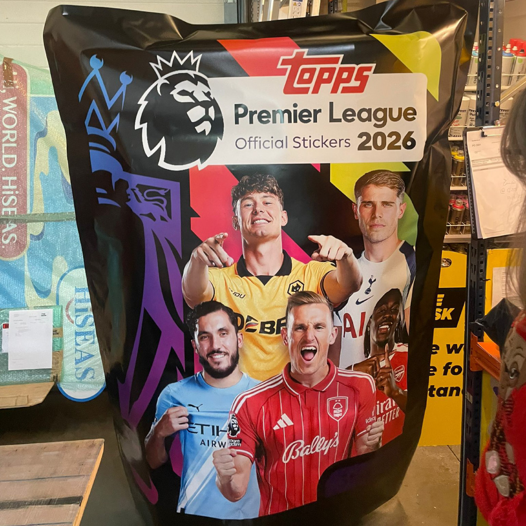 The task was to create 7ft tall sticker packets for footballers to make surprise appearances at various events. Given complete design and artworking responsibility on the project, the main technical issue was to have a material which was easy to rip while the packets kept their structure. The result worked perfectly with the events being featured throughout various media outlets.